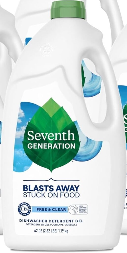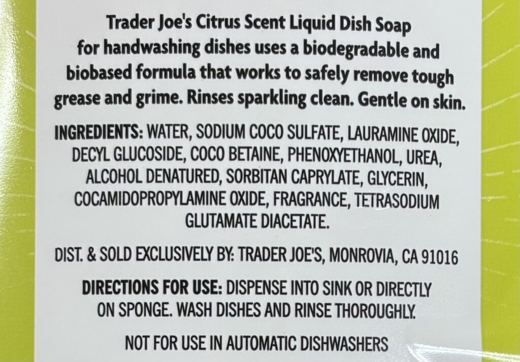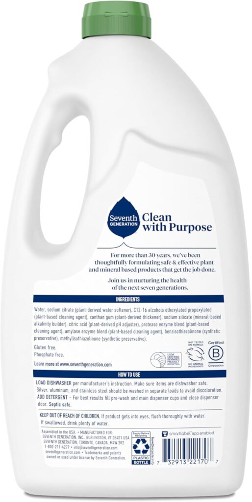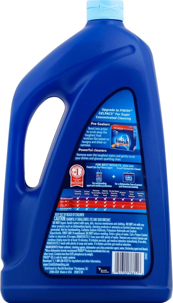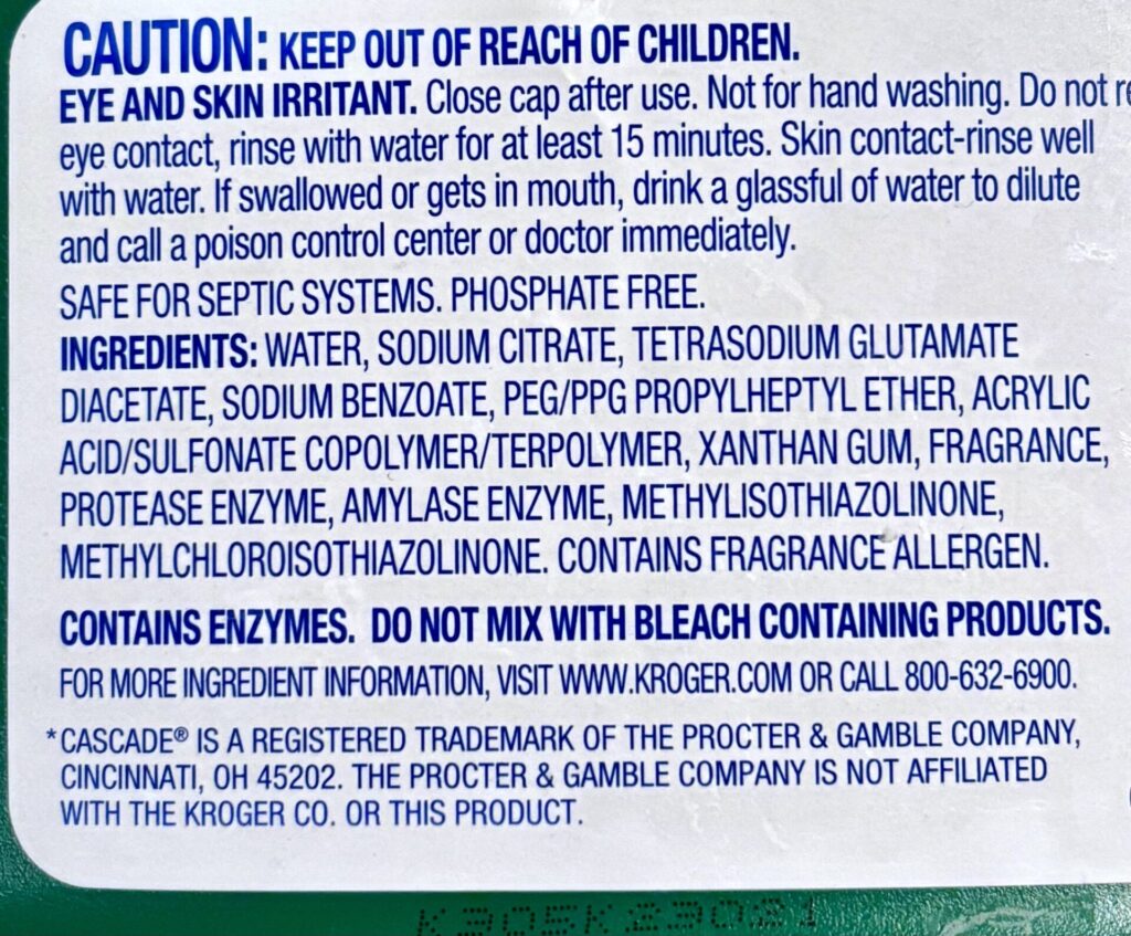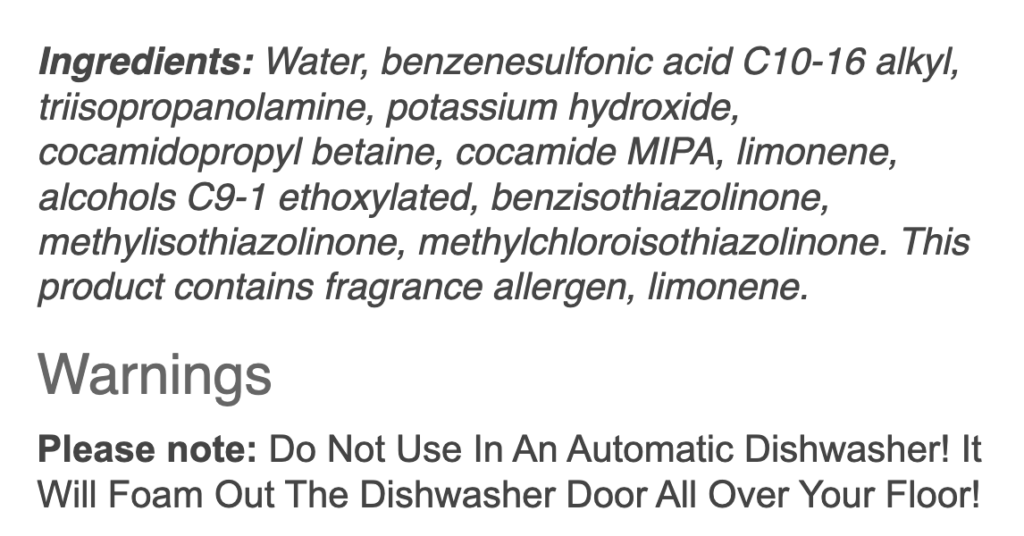 Look at the ingredient list on this bottle: “Water softener, cleaning agents, dishwasher and china protection agent, water, thickening agent and bleach.” That’s the complete list, verbatim.