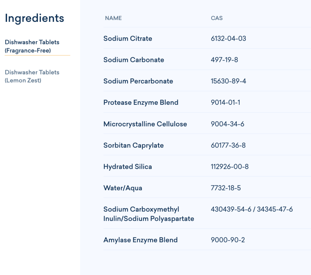Sodium Citrate, Sodium Carbonate, Sodium Percarbonate, Sodium Carboxymethyl Inulin/Sodium Polyaspartate, Protease Enzyme, Amylase Enzyme Blend.