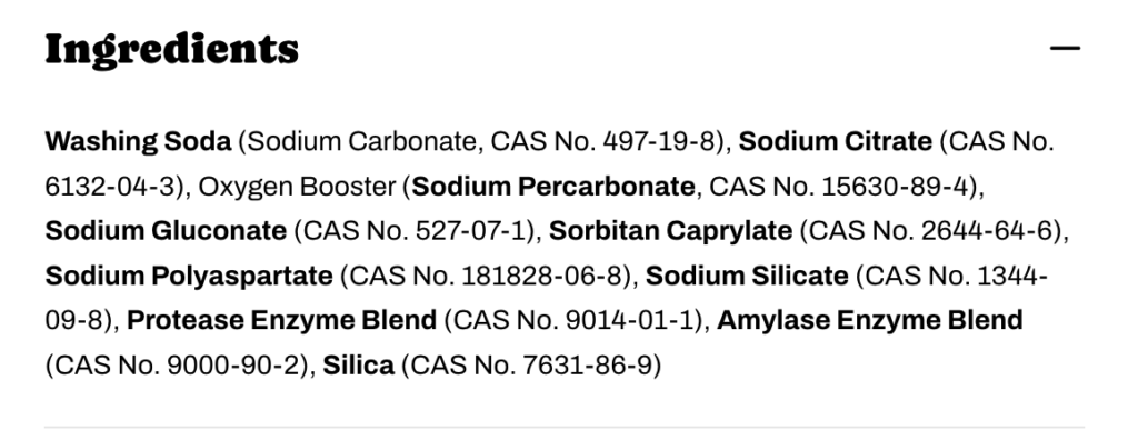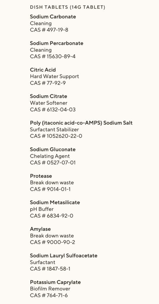 Sodium Carbonate, Sodium Citrate, Sodium Percarbonate, Sodium Gluconate, Sodium Polyaspartate, Sodium Silicate, as well as Protease Enzyme Blend and Amylase Enzyme Blend.