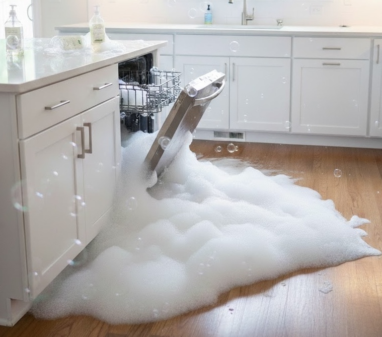 You can’t use liquid soap in your dishwasher, because the thick, slick foam that works so well in the sink will clog the pump and hoses in the machine. It can also cause the kind of bubbly overflow onto your kitchen floor that makes unwelcome (if comedic) photo ops.